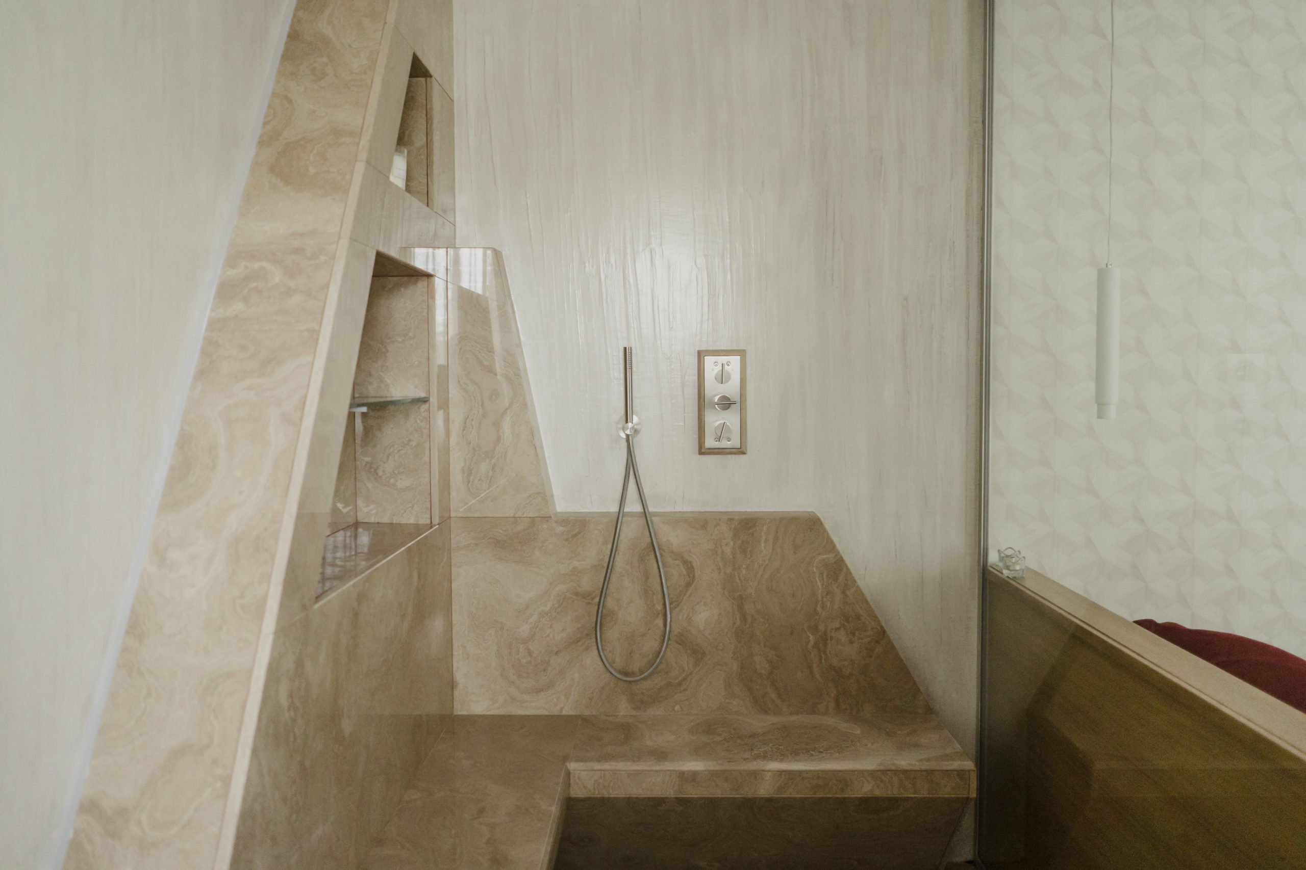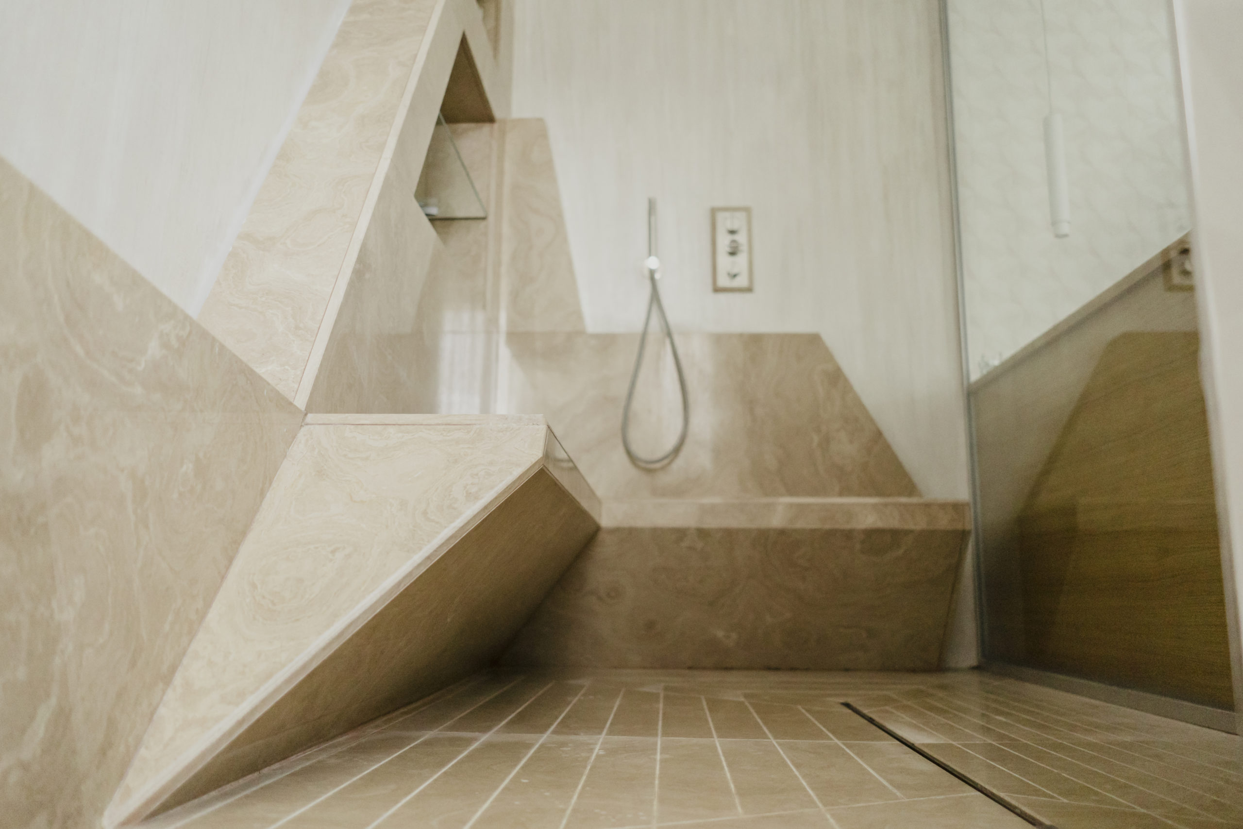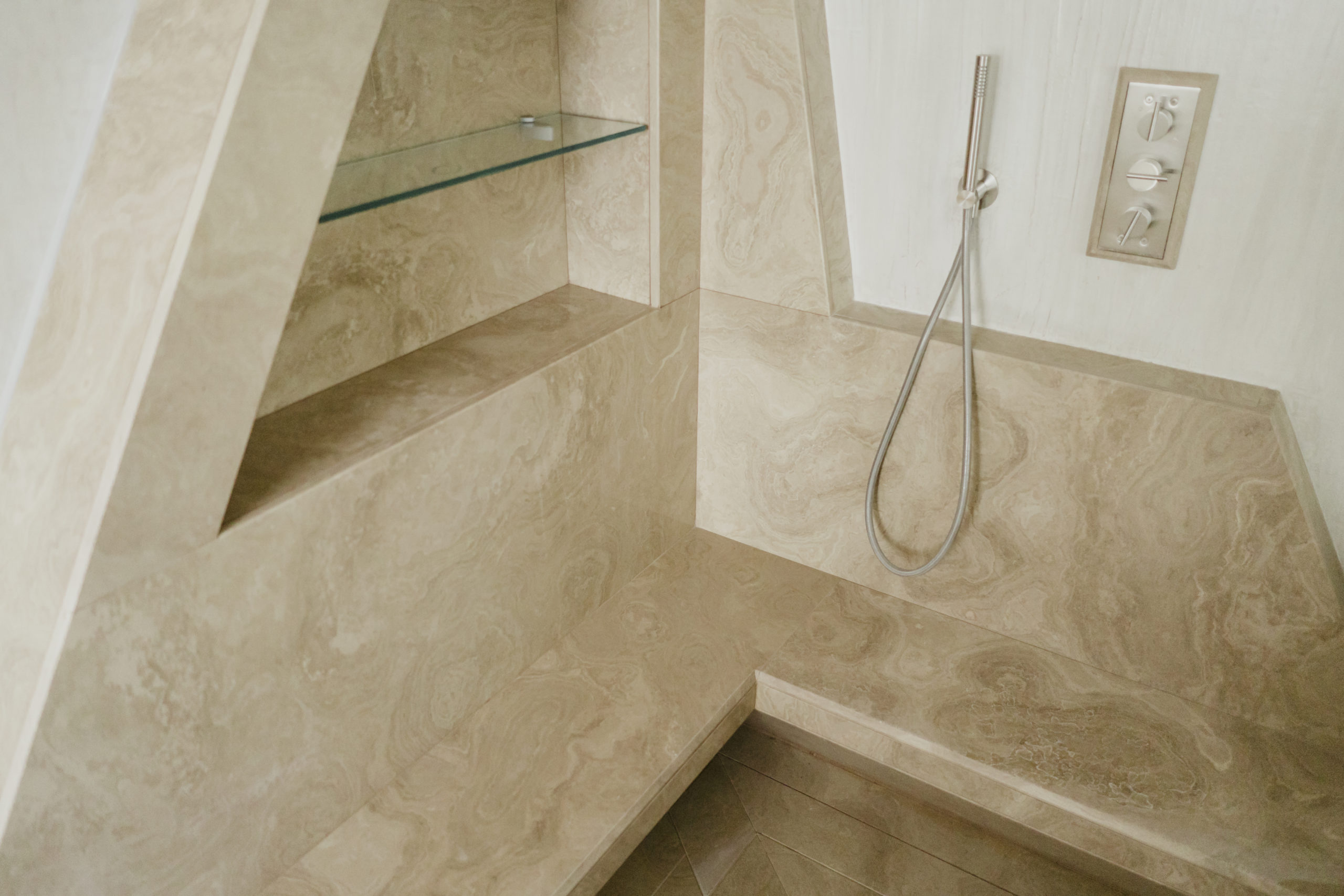 Bianco Michelangelo (rivestimento vasca e lavabo)Travertino romano (piatto doccia e pavimento)